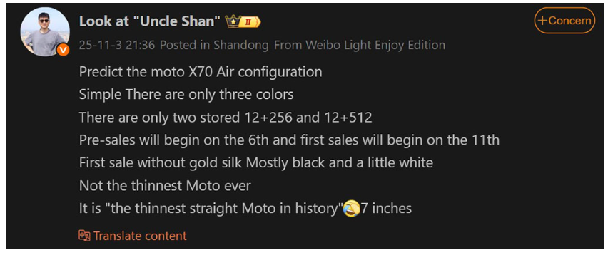 知名爆料達人 UncleKanshan 近日在微博平台透露了這款「Air」系列手機的相關細節。雖然最初其預測內容指向 Moto X70 Air 的內部配置,但不少網民推測,這組消息其實正是針對華為即將推出的超薄設計 Mate 新機。