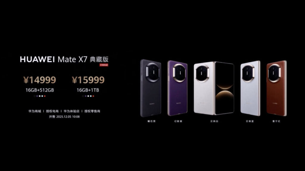 HUAWEI Mate X7 典藏版提供標準版相同五色,具 16+512 及 16+1TB 儲存款式,售價 14,999 人民幣(約港幣 $16,420)起,全系均附旋轉支架保護殼