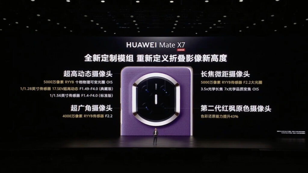 Mate X7 攝影由二代紅楓原色鏡頭,以及 50MP F1.49-F4.0 十級可調光圈 OIS 主鏡、50MP OIS 長焦微距跟 40MP 廣角鏡組成,三組鏡頭均支援 RYYB 陣列。