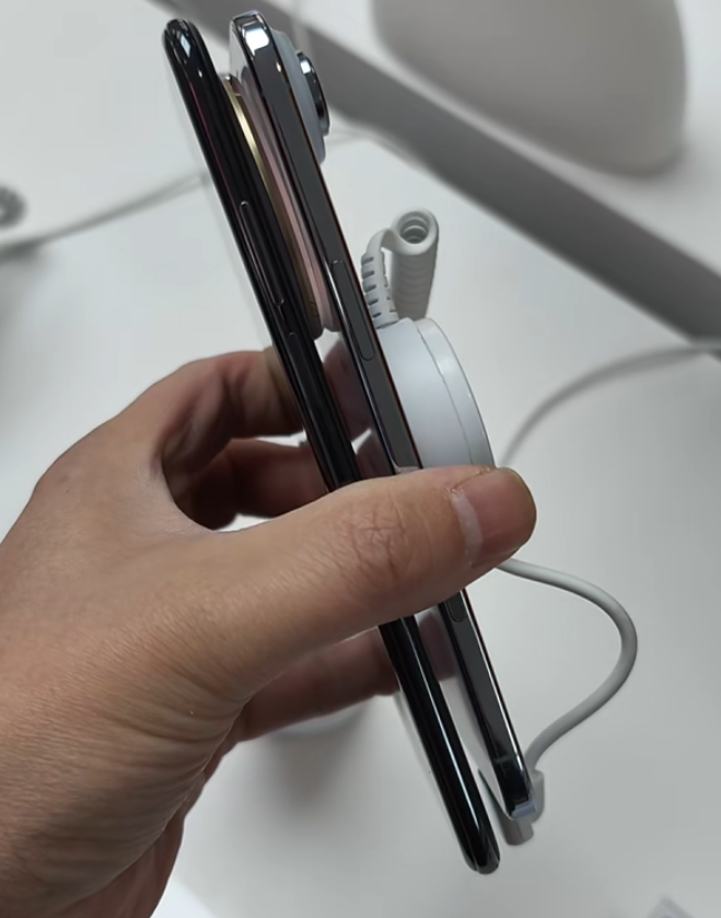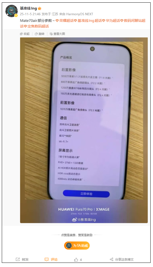 根據官方資料及此前全面曝光的外觀信息,HUAWEI Mate70 Air 的特點在於其突破性的機身厚度僅有 6.x mm。有科技博主搶先進行真機對比,發現其與 iPhone Air 的厚度極為接近,同樣採用亮面中框設計,展現出精湛的工藝水準。