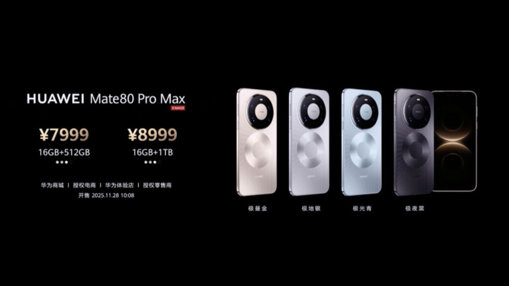 螢幕加大至 6.9 吋的 Mate 80 Pro Max,有極晝金、極地銀、極光青及極夜黑四色款、16+512 / 16+1TB 雙款式,售 7,999 人民幣(約港幣 $8,760)起。
