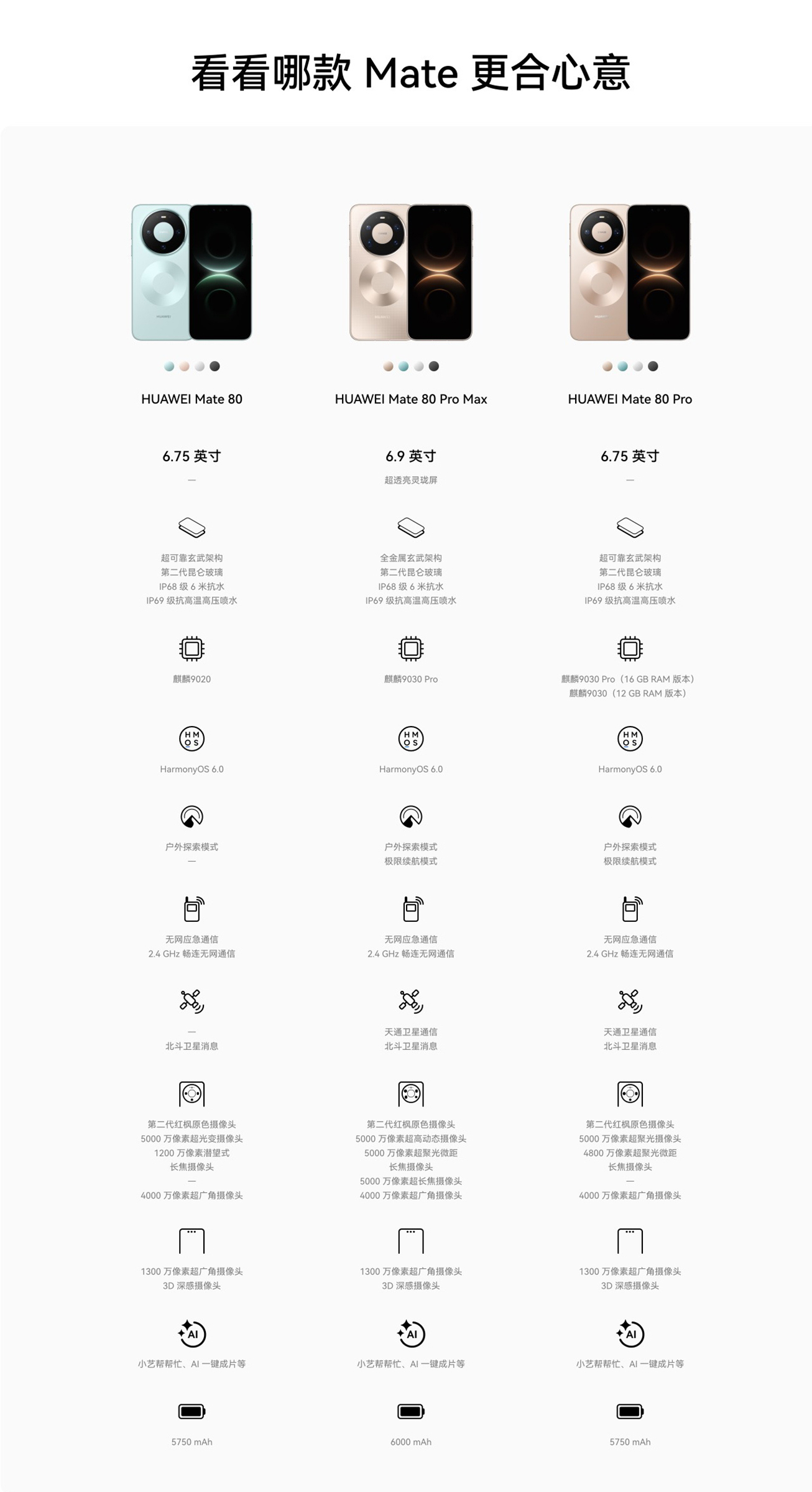 為了讓用家更易分清 HUAWEI Mate 80、Mate 80 Pro 跟 Mate 80 Pro Max 三機分別,HUAWEI 中國官網設置了「看看哪款 Mate 更合心意」欄目(下圖):