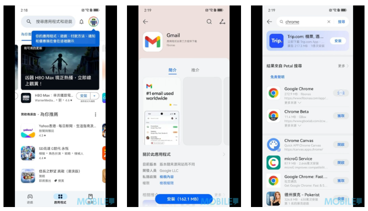▲ 實試可用 Play 商店下載 App,Gmail 跟 Chrome 可於 AppGallery 直接下載