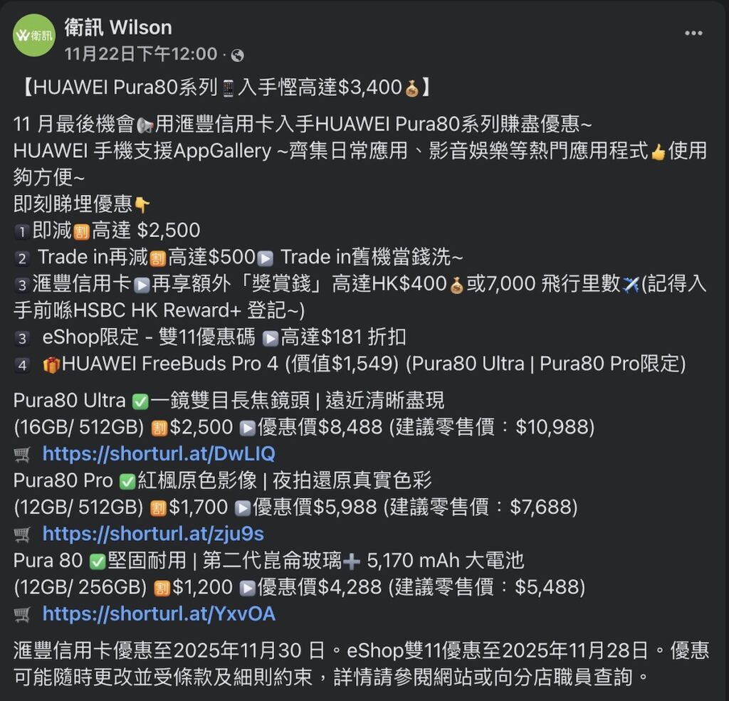 除享優惠價入手 Pura 80 系列,據衛訊 Facebook 專頁資訊,Trade in 舊機可減 $500、以指定信用卡簽賬再享達 $400 回贈,最高可享達 $3,400 優惠。