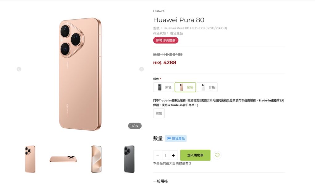 其中港版 12+256 配置 HUAWEI Pura 80 手機,將以優惠價 $4,288 開賣(原價 $5,488),勁減 $1,200 港元、能以不到 4 千 3 價格入手。