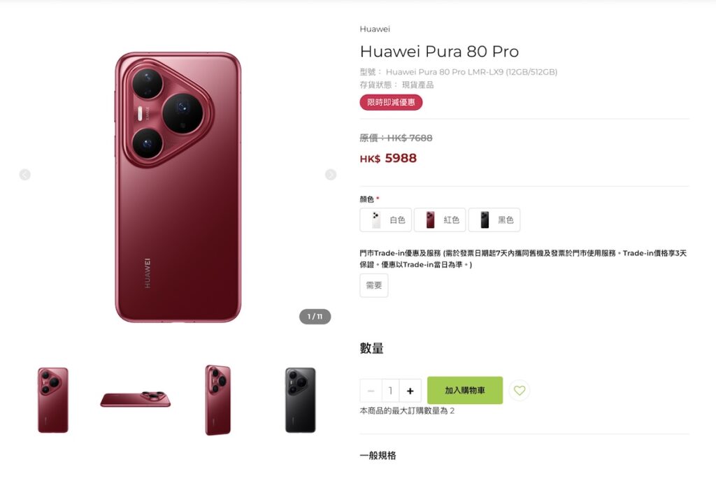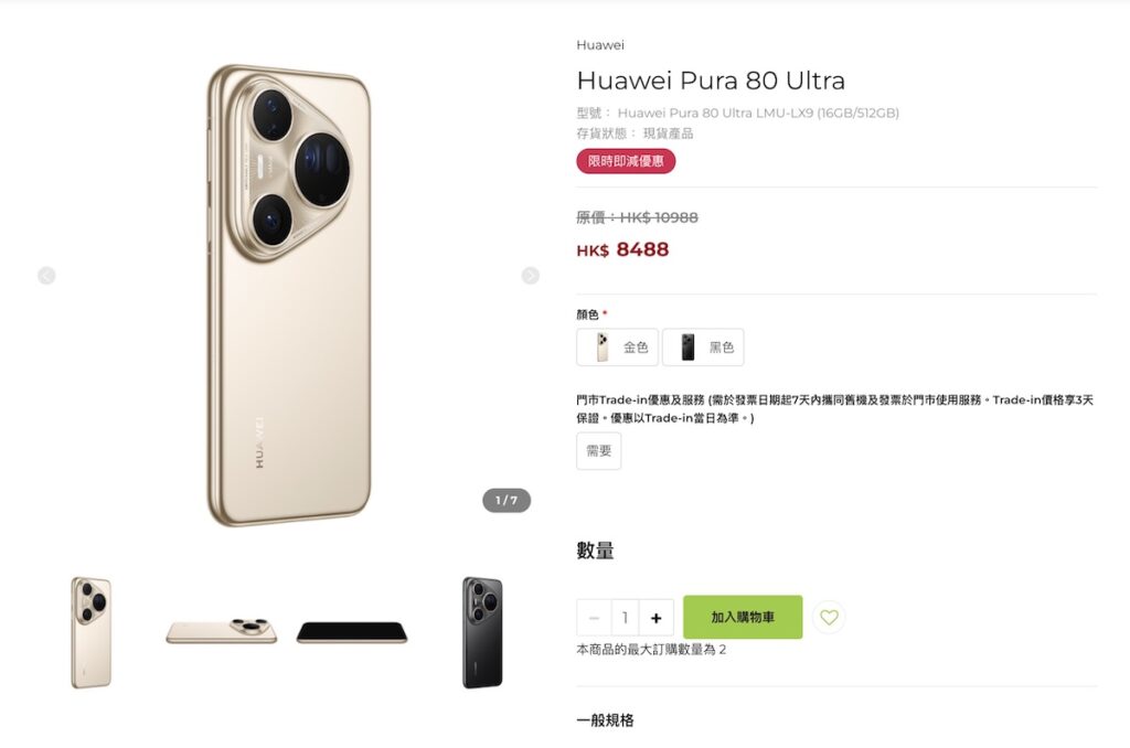 16+512 儲存 Pura 80 Ultra 則以 $8,488 優惠價上架(原價 $10,988),減幅更高達 $2,500 港元。