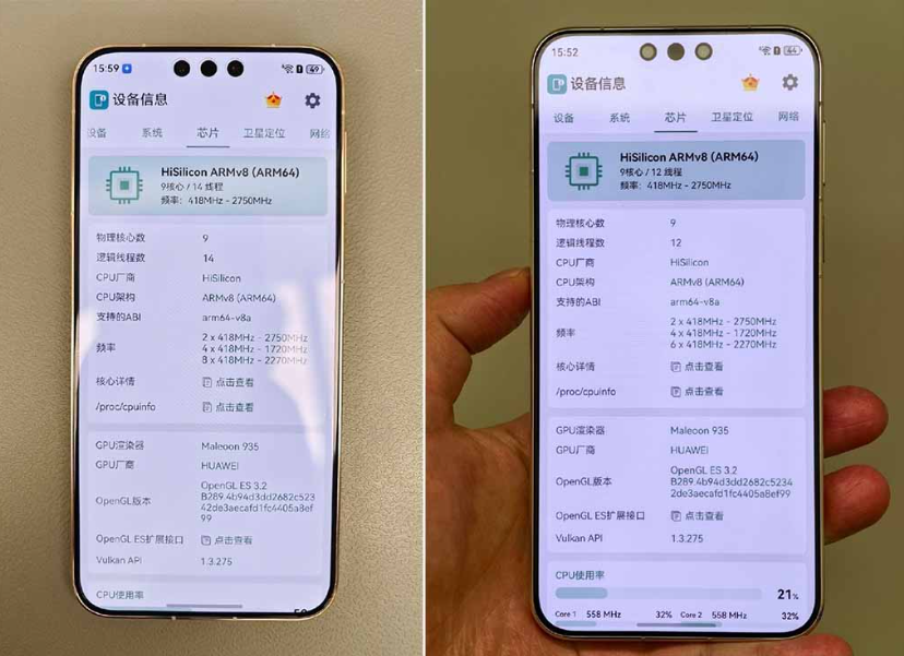 首先在核心架構方面,Kirin 9030 Pro 採用 9 核心 14 執行緒設計,包括 2 個2.75GHz 大核心、4 個 1.72GHz 中核心與 8 個 2.27GHz 核心,搭配 Maleoon 935 圖形處理器。