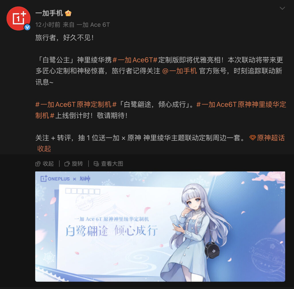 據「一加手機」官方微博帳號資訊,即將推出的 OnePlus Ace 6T 次旗艦手機,確認會同期發表人氣手遊《原神》的定制版本。