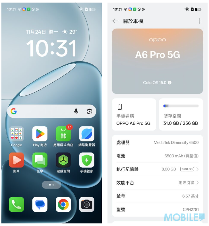 ▲至於系統方面,OPPO A6 Pro 5G 預裝 Android 15 + Color OS 15 UI,256GB ROM 版扣除原裝系統後,仍有224 GB 空間供用戶使用。另外,Color OS 15 UI 首次引入了「ColorOS Trinity Engine」及「Luminous Rendering Engine」。系統還加入的「久用保養」功能,透過性能優化、儲存空間清理與權限管理等方式,旨在減緩手機隨使用時間增長而可能出現的性能衰減現象。