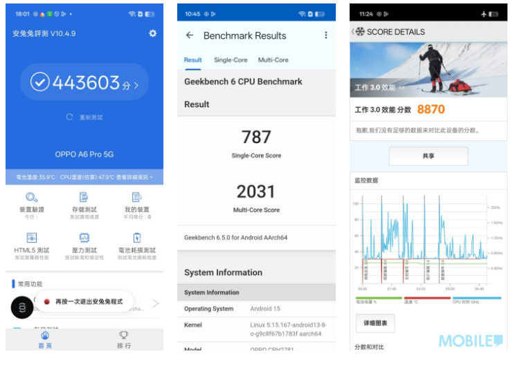 性能方面,OPPO A6 Pro 5G 搭載了 MediaTek 天璣 7300 處理器,儲存配置為 8GB RAM 與 256GB 容量。這個組合對於日常的社交媒體、網頁瀏覽、影片串流及輕度遊戲等應用,能夠提供足夠的流暢度。
