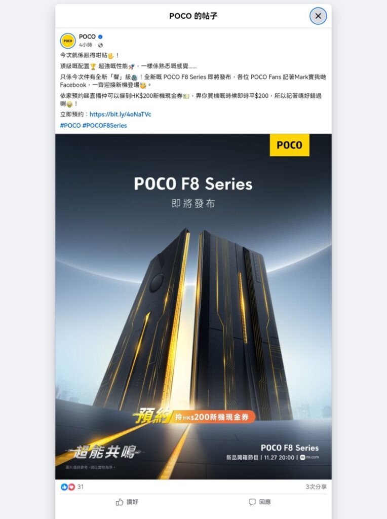 POCO 已正式宣布,將於 11 月 26 日下午 4 點在印尼峇里島舉行 POCO F8 系列新機發表會。雖然官方尚未公開具體型號,但預期將推出 POCO F8 Pro 與 F8 Ultra 等機種。目前 POCO 香港的 Facebook 粉絲專頁已展開預約活動,成功預約者可獲得 $200 新機折扣。