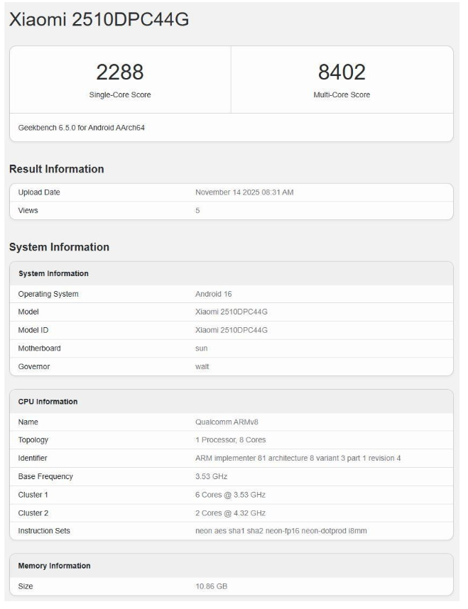昨日於 Geekbench 數據庫中發現了型號為 Poco F8 Ultra 的工程機跑分紀錄,顯示該機將搭載 Snapdragon 8 Elite Gen 5 處理器。而今日同系列的 Poco F8 Pro 也現身同一平台,確認採用標準版 Snapdragon 8 Elite 晶片。