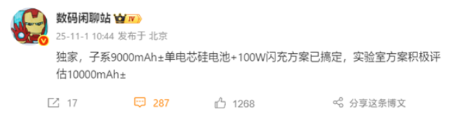 近日數碼博主「數碼閒聊站」透露,某品牌旗下子系列已成功研發約 9000mAh 的單電芯硅電池,並支援 100W 閃充,甚至實驗室中正在積極評估容量達 10000mAh 左右的進階方案。