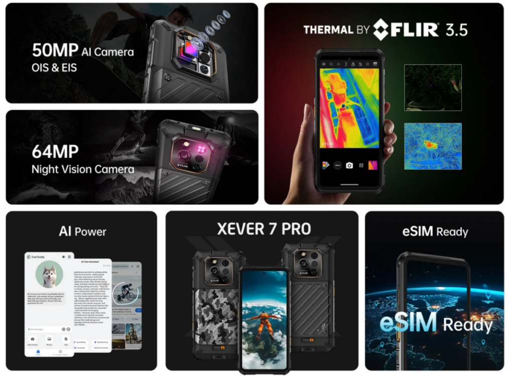 Xever 7 Pro 配備 5,000 萬像主鏡頭(OIS)、6,400萬像夜視鏡頭與 FLIR 熱成像鏡頭,支援 -10°C 至 450°C 精準溫度測量。Xever 7 則搭載 5,000 萬像主鏡頭、6,400 萬像夜視鏡頭與 5,000 萬像超廣角鏡頭。