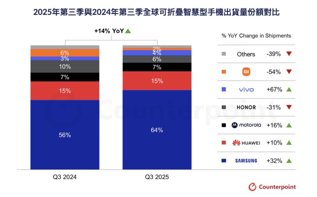 市場調查機構 Counterpoint 早前發表了 2025 年第三季全球市場可摺疊螢幕手機出貨量報告,指出該季出貨量年同比增長達 14% 為季度歷史新高,並持續看好未來發展。