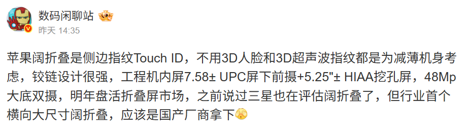 一直有傳聞指出,Apple 將於明年正式進軍摺疊手機市場,推出暫被稱為「iPhone Fold」的裝置(最終官方名稱仍未確定)。今日,國內爆料者「Digital Chat Station」於微博分享了更多關於這款新機的細節。