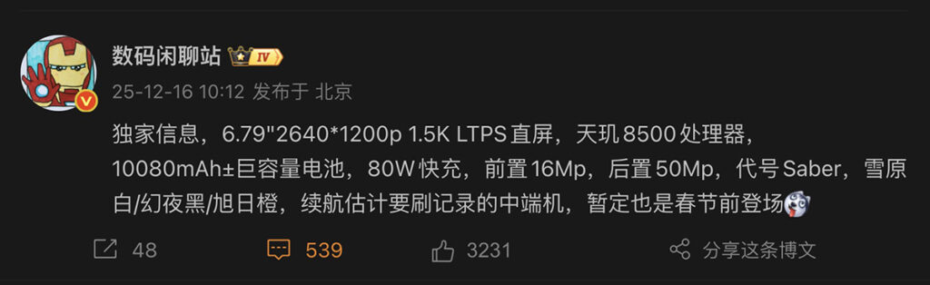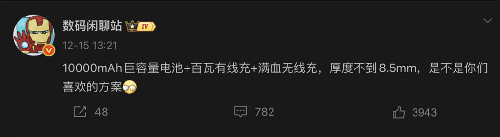至於爆料人另文提及,小米可能推出配備 10,000mAh 電池、配備 100W 有線 / 「滿血」無線充電及不到 8.5mm 厚度機型,預計將走旗艦機型路線。