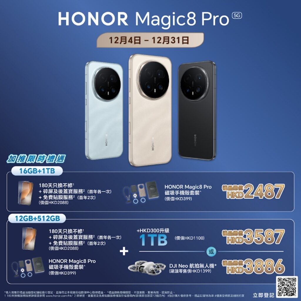 據 HONOR 香港公佈資訊,由即日起至 12 月 31 日期間,購買港版 HONOR Magic8 Pro(售價 $7,899 起)即可獲高達 $3,886 港元豐厚禮品(見下圖):