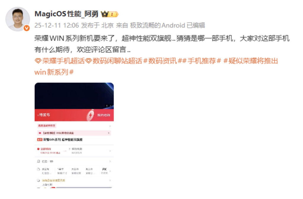 此外 HONOR 性能優化研發工程師「MagicOS性能_阿勇」,又透過微博帳號預告 HONOR WIN 系列新機即將推出,惟本文刊登時該博文似乎已被刪除。