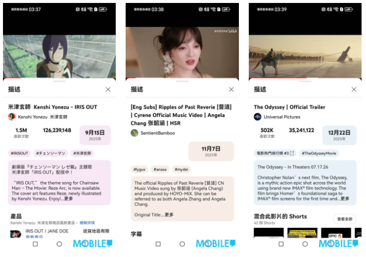 ▲ 張韶涵《昔漣》女聲(中)貼耳聲調自然圓潤,《奧德賽》預告片(右)電影音效聲場廣度不錯
