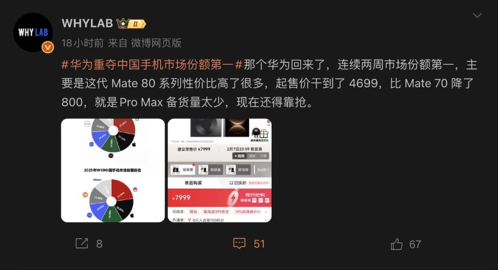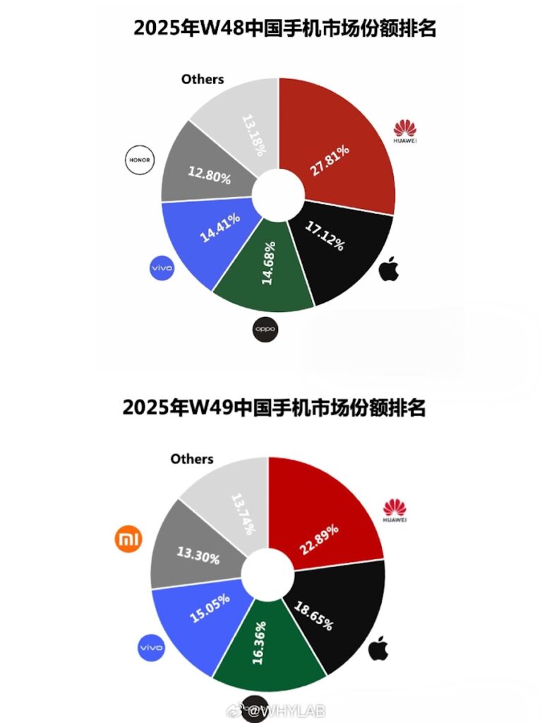 據數碼博主「WHYLAB」提供資訊,HUAWEI 已連續在 2025 年第 48 及 49 週,蟬屏國內手機市場份額排名榜一,力壓次席 Apple 跟第三 OPPO。