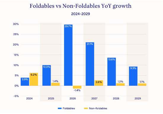 另一方面,SAMSUNG 憑藉其全新三摺疊機型 Galaxy Z TriFold 持續拓展市場。該機型被視為 HUAWEI Mate XT 系列的直接競爭對手,搭載多項創新技術。報告預測,受惠於首款三摺疊手機的市場需求,SAMSUNG 明年在摺疊領域的年成長率可望達到 30%。
