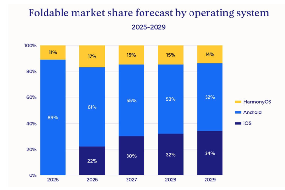 根據 IDC 基於作業系統的摺疊手機市場份額預測圖表(2025–2029 年),HarmonyOS 的市佔率將從 2025 年的 11% 上升至 2026 年的 17%。不過,隨著蘋果在後續幾年加入戰局,HarmonyOS 的份額可能逐步受到擠壓。