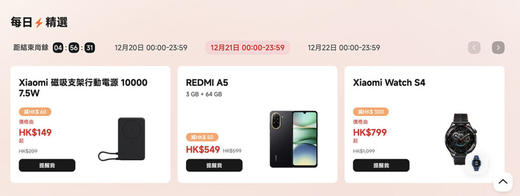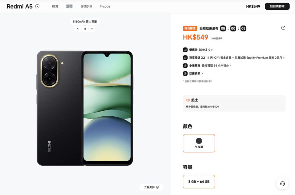 今日(12 月 19 日)可以優惠價 $549(原價 $599)入手 3+64 配置黑色款 REDMI A5,若錯過仍可留意 12 月 21 日(週日)將有相同優惠於活動網頁上架。