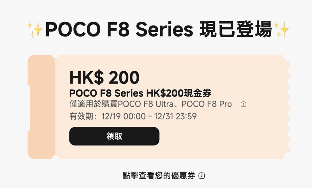 與此同時小米子品牌 POCO 旗艦手機新作 F8 系列,由即日起至 12 月 31 日經官方活動網頁領券後,入手 F8 Pro / F8 Ultra 手機即可享 $200 折扣優惠。
