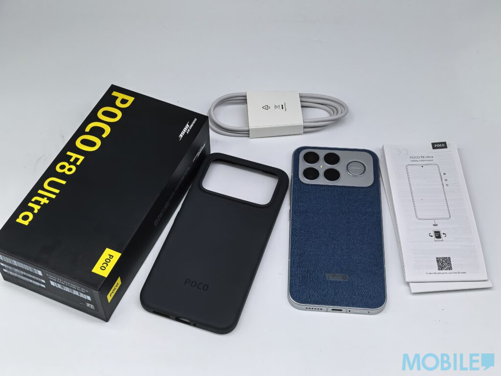 開箱牛仔藍色款 POCO F8 Ultra 手機,只提供 USB 充電線跟專屬軟膠機套,需自行準備充電器。