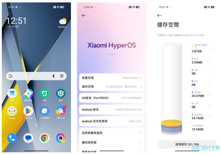 港版 POCO F8 Ultra 預載 HyperOS 3.0 系統,512GB 機型啟動後約佔用 41.2GB 空間(6GB 虛擬記憶體),另外可撥出達 16GB 空間至虛擬記憶體。