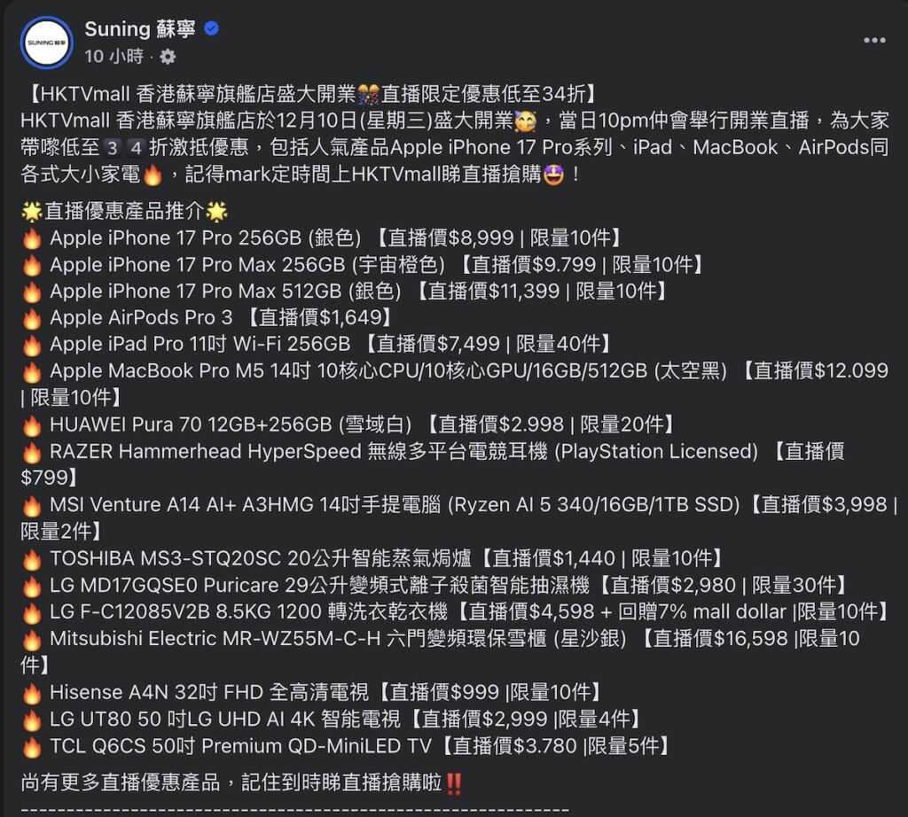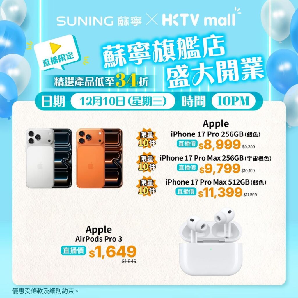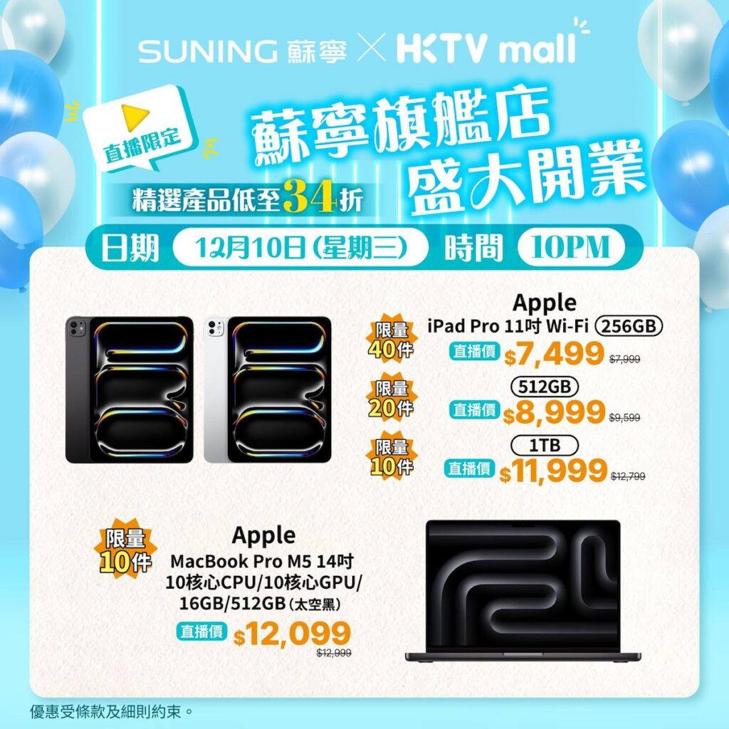 是次優惠由蘇寧香港 HKTVmall 旗艦店提供,其將於香港時間今日(12 月 10 日)晚上 10 時舉行開業直播,詳情可留意蘇寧香港 Facebook 專頁更新。