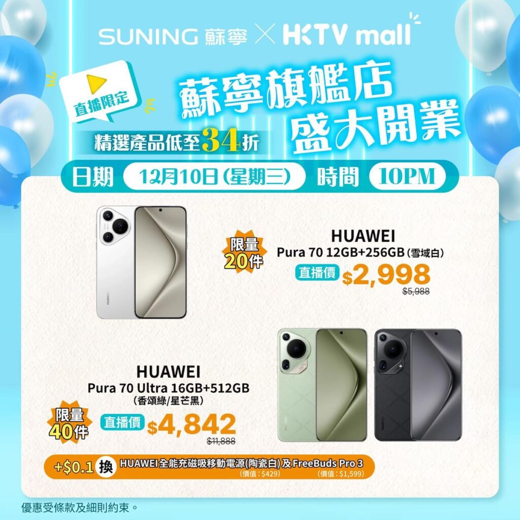 HUAWEI 手機有直播價 $2,998 限量 20 部 Pura 70 12+256(原價 $5,998)、跟限量 40 部直播價 $4,842 的 Pura 70 Ultra 16+512(原價 $11,888)。
