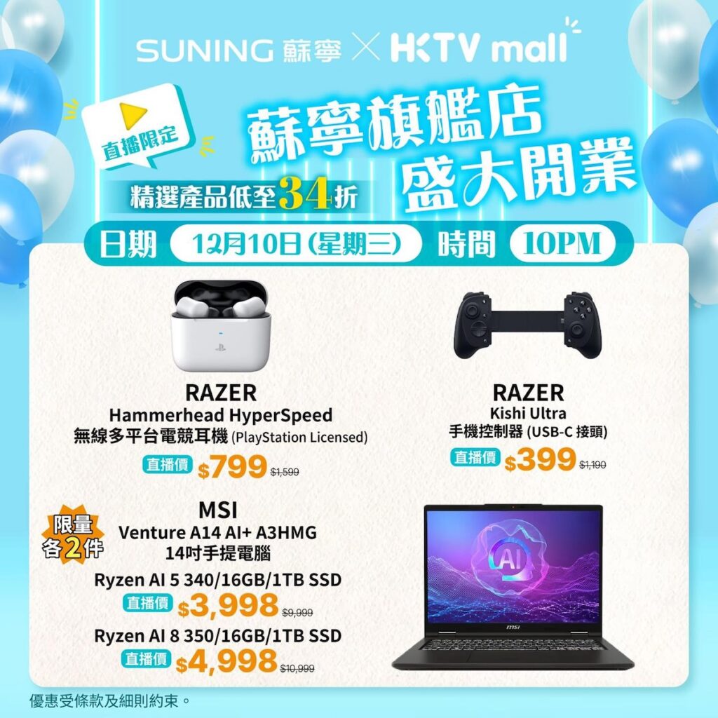 其他數碼產品尚有直播價 $3,998 起限量 2 部 MSI Venture A14 AI+ A3HMG 筆電(原價 $9,999 起),及 RAZER 電競耳機跟手機控制器等。