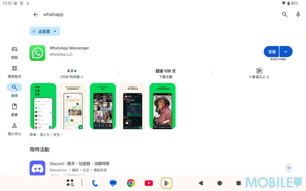 ▲而且於 Play 商店上,更可以直接安裝 WhatsApp 於平板上使用。