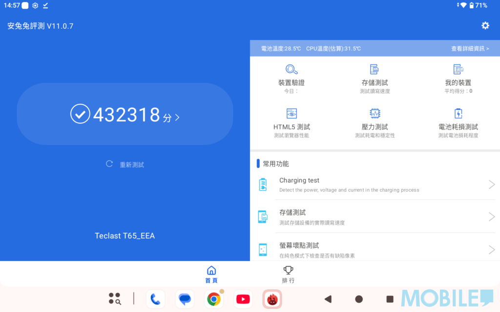 配合 8GB RAM 及透過技術擴展實現的 20GB 記憶體組合,在多任務切換及日常應用程式運行上,基本能保持流暢。實測開啟多個社交應用、文檔處理軟件及一個影片播放程式,未出現明顯卡頓。對於一般文書處理、網課學習或影音娛樂需求,這套配置足以應付。