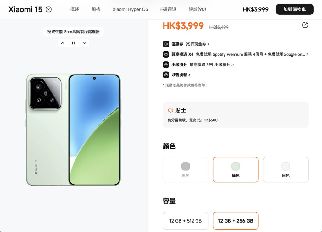 本文刊登時 Xiaomi 15 產品專頁已更新價格,具綠及白色款選擇、Xiaomi 15 標配 12+256 機型新價 $3,999(原價 $5,499)上架;