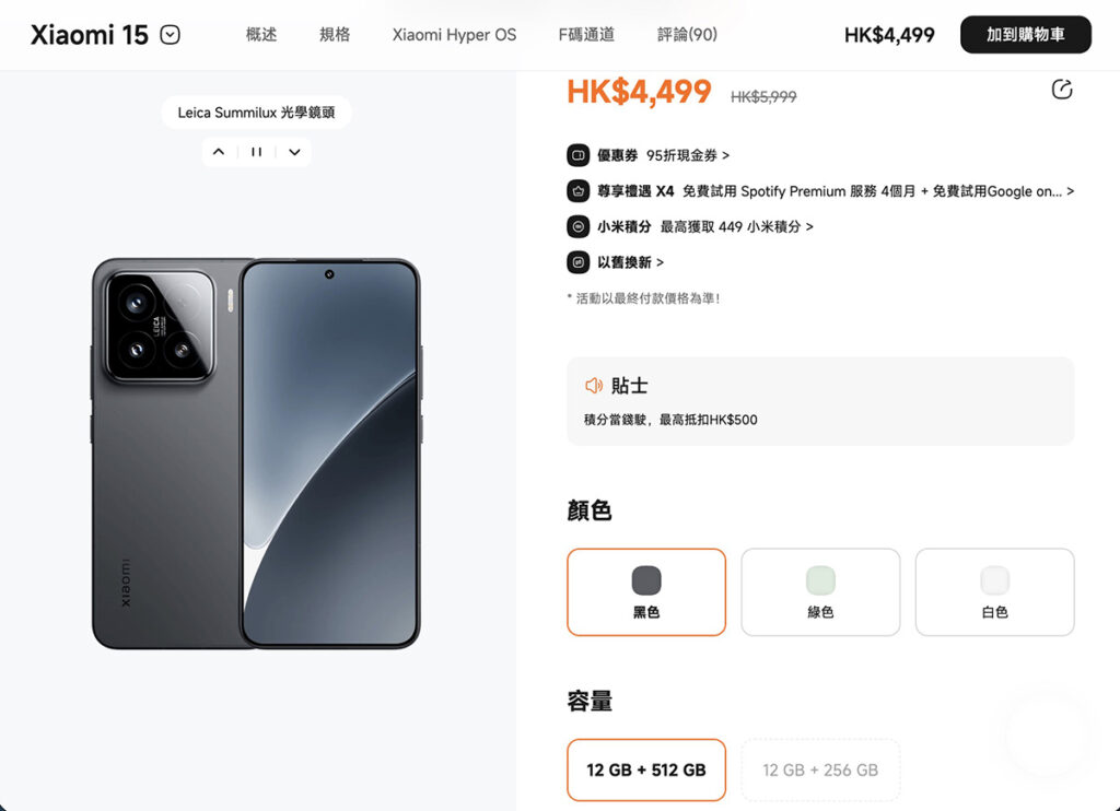 而加入黑色款(黑、綠、白)的 Xiaomi 15 手機,12+512 新價則變成以 $4,499(原價 $5,999)開賣,兩款配置均享有 $1,500 港元減幅。