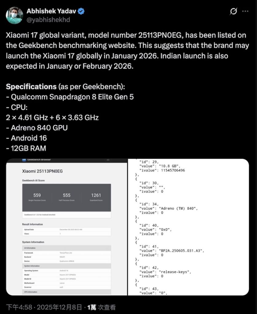- Xiaomi 17 國際版現身 GeekBench 數據庫!傳最快 2026 年 1 月發佈、「這型號」或同期推出