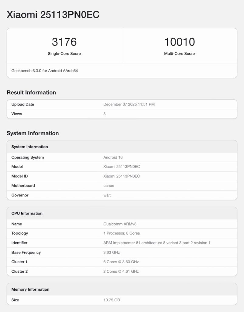 從截圖中可看到,Xiaomi 17 海外版將同具 S8E Gen5 晶片、受測裝置配備 12GB RAM 儲存,《GeekBench 6》測試獲 3,176 單核、10,010 多核成績。