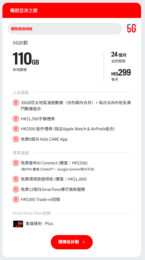 SmarTone 依然維持其優質網絡形象,主打的 $299 計劃提供 110GB 本地數據,並於合約期內贈送約 35GB 的亞太區漫遊數據。雖然漫遊數據是按合約總量計算,但 SmarTone 的核心價值在於其「AI Connect」功能,讓用家在海外也能免 VPN 穩定使用各種 AI 工具,對商務人士極具吸引。配合其「全港最強 5G 網絡」的口碑,對於追求斷網風險極低的人士而言,SmarTone 仍是穩健之選。