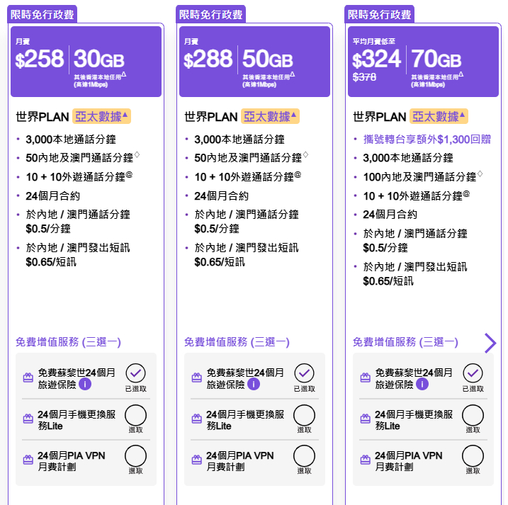 3HK 最新推出的「世界PLAN – 亞太區」計劃,月費由 $258 起,最大的亮點在於其漫遊數據採用「每月計算」模式。與市場上部分將漫遊數據按兩年合約期「一次過發放」的做法不同,3HK 每月提供固定 30GB 數據供本地、內地、澳門及亞洲 多個熱門國家共享。這對於每月都要飛日本、韓國或泰國工作的用家來說,數據配額更易預算,唔怕合約初期用得太盡,後期無以為繼。此外,3HK 更慷慨送出蘇黎世旅遊保險及手機現金券,誠意十足。