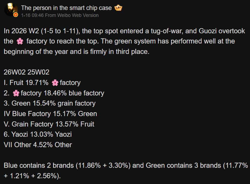 根據微博知名爆料帳戶「Smart Chip Insider」最新數據,2026 年首兩週(1月5日至1月11日)國內手機市場排名正式出爐。APPLE 與華為展開激烈競爭,雙方市佔率差距極小,預示著全年冠軍爭奪戰將異常緊湊。