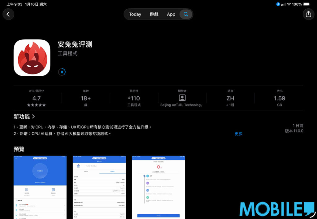 本文刊登時 iOS 跟 iPadOS 平台《Antutu》V11 版已開放升級,據更新日誌資訊其加入 CPU AI 運算、儲存 AI 大模型讀取,及日常辦公及多媒體應用的測試場景。