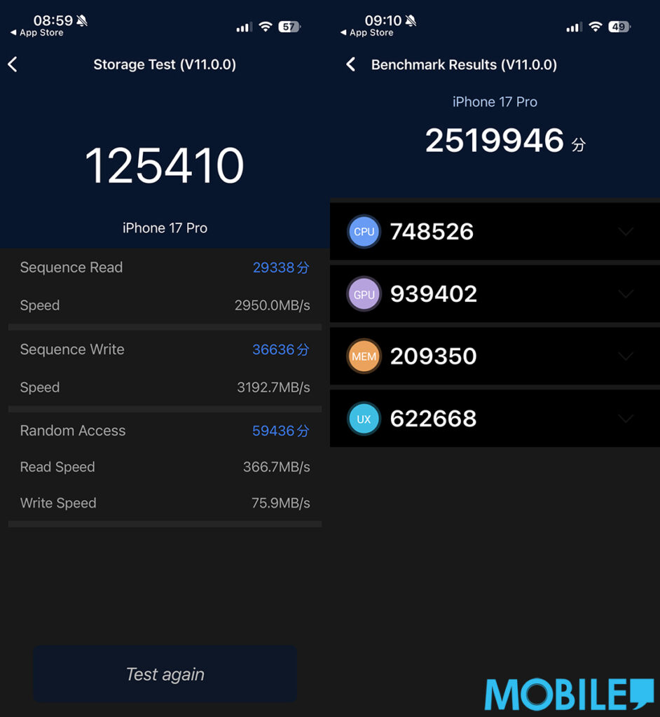 實測以 512GB 版本 iPhone 17 Pro 試行《Antutu》V11 版獲 2,519,946 分數,儲存測試得分為 125,410;