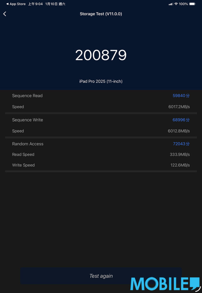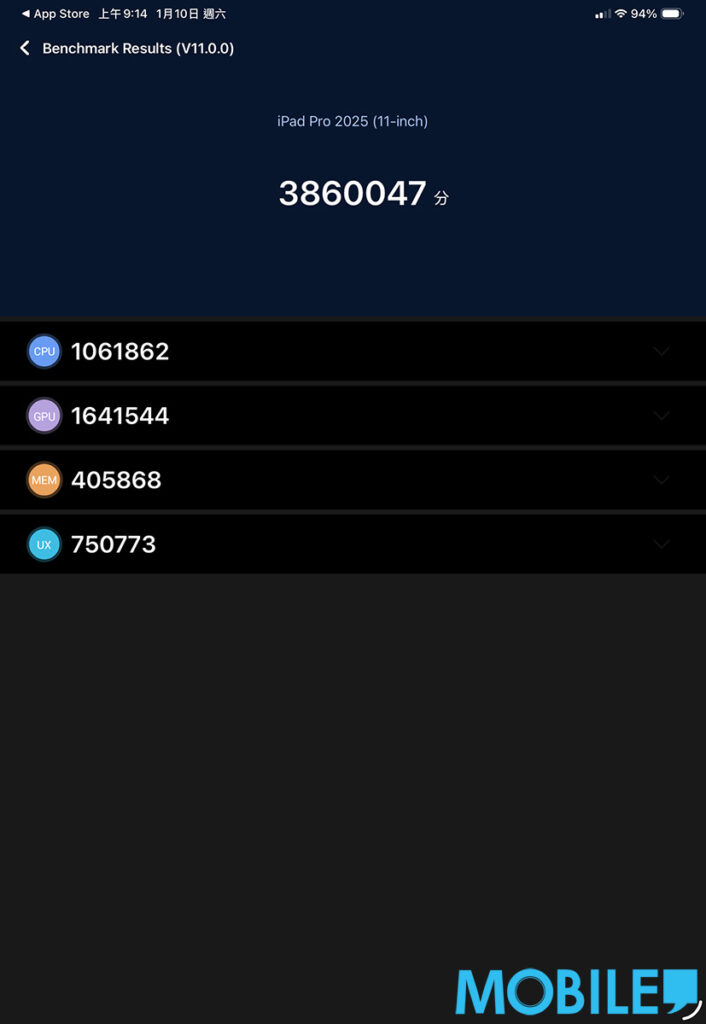 而 512GB 版 M5 iPad Pro 11 吋試行《Antutu》V11 版就獲 3,860,047 分數、儲存測試得分為 200,879。