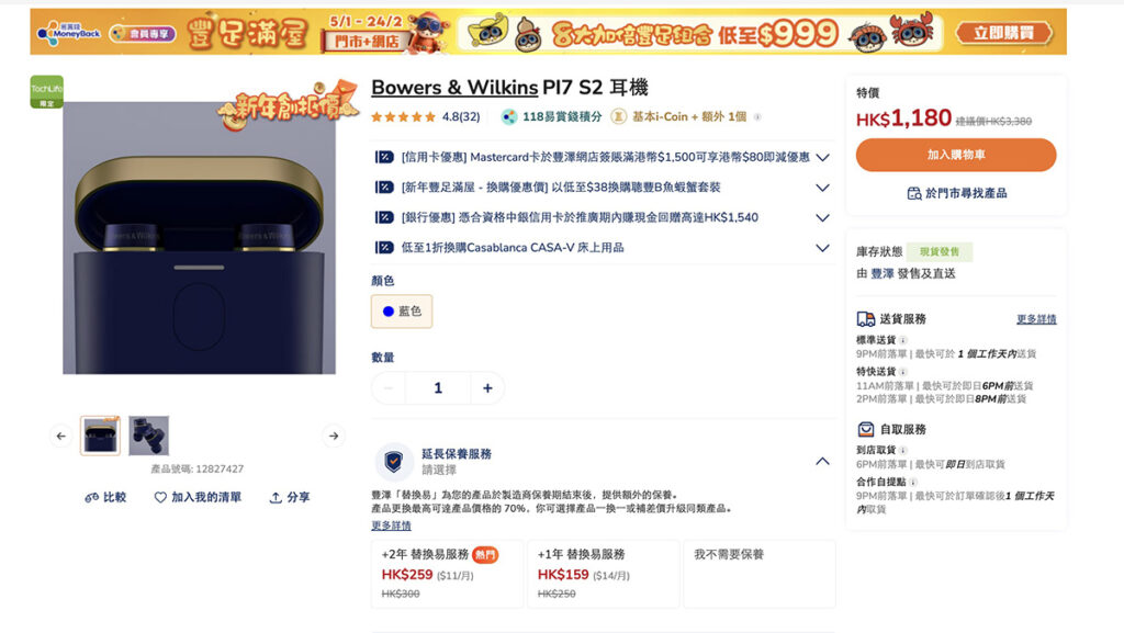 是次優惠由豐澤香港官方網店提供,受惠型號為 Bowers & Wilkins Pi7 S2 真無線耳機藍色款,以優惠價 $1,180 開賣(原價 $3,380)勁減達 $2,200 港元。