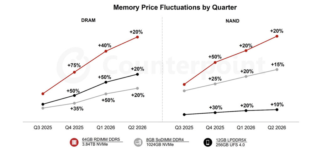 據市場調查機構 Counterpoint 日前發表報告,提到 2025 第四季記憶體價格急增 40-50%、到 2026 第一季將再上漲 40-50%,甚至第二季預計仍有 20% 漲幅。