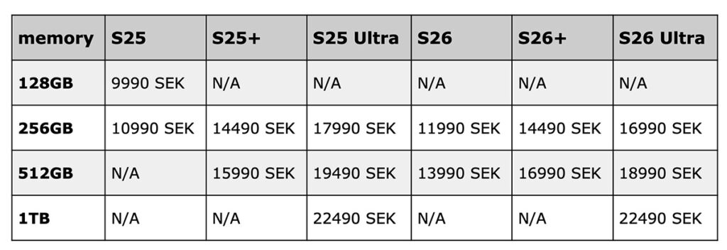 好消息是旗艦機型 S26 Ultra 價格不增反降,256GB 及 512GB 分別售 16,990 及 18,990 瑞典克朗,較前代 S25 Ultra 分別便宜 1 千及 5 百克朗(見圖表):