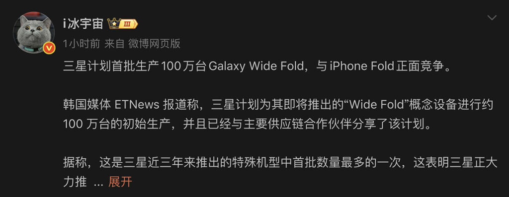 據爆料達人 Ice Universe 引據韓媒資訊,指三星或在現有摺屏手機產品線上,加推採用 4:3 比例闊摺屏 Galaxy Wide Fold 手機,以對應傳聞中 iPhone Fold 裝置。